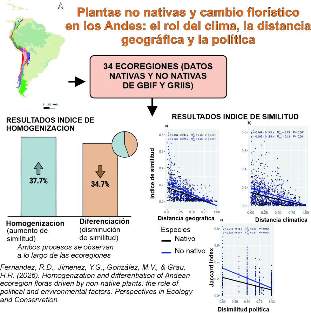 1Fernandez, R. D., Jimenez, Y. G., González, M. V., & Grau, H. R. (2026). Homogenization and differentiation of Andean ecoregion floras driven by non-native plants: The role of political and environmental factors. Perspectives in Ecology and Conservation. Advance online publication. https://doi.org/10.1016/j.pecon.2026.01.003